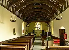 The Grade I parish Church of St Andrew (grid reference SO5684263253), is church of local sandstone, of chancel, nave, west tower, and south porch. It dates to the 12th century, with the chancel and tower from the 13th. The church was restored in the late 19th century when a south porch and organ chamber were added, and the chancel south wall rebuilt. A stone slate roof was added in the 20th century. The tower is of three stages and llancet windows are topped with a pyramidal roof; the bell stage contains three bells. The nave at the south contains a 19th-century two-light traceried window either side of the porch, and the same on the north. Between the nave and chancel is timber chancel arch. The chancel south side shows a blind doorway beside a 19th-century trefoil headed window. The east window, also 19th century, is of three lights and traceried. The nave roof, under the 20th-century tiles, is of 14th-century trussing. The trussed chancel roof dates to the 17th century and, on its north side is an arched recessed organ room. The interior contains a 12th-century bowl font which might have originally come from Pudleston. Wall monuments date to the early 18th century, with a floor ledger slab dated 1644.[4][34][41][42][43]