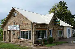 The Lee Service Station is a historic commercial building at 28 South Broadway in Damascus, Arkansas. It is a single-story frame structure with a cross-gable roof configuration, its exterior finished in stone veneer with brick trim. It has a single former garage bay on the right side, the bay opening now enclosed with a pedestrian door at its center. To its left is an office space, with a center entrance flanked by a large multi-pane windows. Door and window openings are trimmed in brick laid in a three-in, three-out pattern, and the stone veneer is in a herringbone pattern. These design elements are all signatures of the builder, Silas Owens, Sr., the master mason who finished the exterior about 1940. The building served as an automobile filling and service station through the 1950s, and has since seen a variety of other commercial uses.[2]