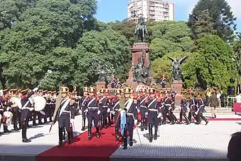 The battle of San Lorenzo, the only battle actually fought by San Martín in the modern territory of Argentina, is the theme of the San Lorenzo march. The military march was composed in February 1901 by Cayetano Alberto Silva following a proposal from Representative Celestino Pera. It was first officially played on October 30, 1902, at the inauguration of the monument to General San Martín in Rosario. The lyrics were written by professor Carlos Benielli in 1908.[22] The march became famous in other countries and, according to the Argentine British Community Council, it has been considered in Europe to be one of the five best military marches ever written.[23] The military bands of Uruguay, Brazil and Poland, amongst others, include it in their musical repertory.[23]