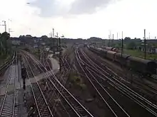 The Riesa–Zeithain section, including the three-track Elbe crossing,[29] and the new selection of line connecting to the Berlin–Dresden railway were completed as part of the third stage of construction. The 13 km long upgrade of the line between Dresden-Neustadt and Coswig began in the autumn of 2009 and is expected to be completed in 2016. As a result of the upgrade, two separate tracks will be established for both the long-distance traffic and the Dresden S-Bahn. The signalling and the S-Bahn stations along the line are being completely renewed and a new Dresden Bischofsplatz station is being built as part of this work. Once the work is completed, the speed limit on this section will increase for long-distance and regional traffic from 120 km/h to 160 km/h.[30] Work has not begun on sections of this line at Riesa station and on the Röderau–Zeithain junction and Zeithain junction–Weißig sections.[23]