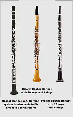 Clarinets of different moods are produced with the German and the French fingering system as well as those with the Reform Boehm system.[4] With German system (Oehler) 10 models in Bb and A,[5] of which one is a Viennese model with further bore,[6] three models in C, and four in D and high-Es are offered. The lower section is covered by three basset horns in F[3] and three long bass clarinets ranging to low-C. With the French system (Boehm) the company manufactures four models in Bb and A, with the reform Boehm system six models in Bb and A, a Bassett clarinet in Bb and A and three models in C, D and Es, as well as a basset horn in F.[3] The instruments are made to order, using grenadilla wood, on special request also from cocobolo.