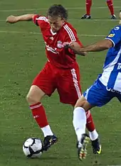 Lucas returned with a bronze medal and Benítez had high hopes for the Brazilian's future, stating, "This season he will improve because he is a very, very good professional and has experience of the Olympic Games."[16] Lucas noted that Liverpool's squad was much improved from the previous season and relished the opportunity to compete for trophies, despite the increased difficulty of getting a first-team place.[17] However, after a number of disappointing performances,[18][19] both critics and fans voiced concerns about Lucas' quality and his confidence was further knocked when Liverpool fans booed him after a lacklustre draw against Fulham. The criticism irked Benítez and he responded with a passionate defence of the player, saying that "people just don't know how good Lucas is."[20] Benítez also underlined Lucas' credentials, stating that he had been captain for both Grêmio and his national youth team, and that competing for place against Javier Mascherano, Steven Gerrard and Xabi Alonso was inherently difficult. Lucas' performances in December 2008 for Liverpool drew him much praise from pundits, the highlight being his performance in the 5–1 thrashing of Newcastle United, where he provided an assist for Gerrard.[21][22] Lucas was sent off in a cup tie against Mersey rivals Everton, which Liverpool lost. This compounded his growing unpopularity amongst Liverpool's supporters, after he gave away a late penalty in Liverpool's previous match, a 1–1 draw with Wigan Athletic.[23][24]