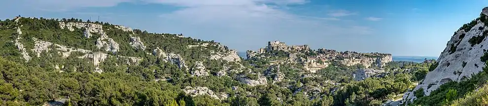 It is located in the Alpilles mountains, northeast of Arles, atop a rocky outcrop that is crowned with a ruined castle overlooking the plains to the south. Its name refers to its site: in Provençal, bauç is a rocky spur. From the village name the word bauxite was coined for aluminium ore when first discovered there by geologist Pierre Berthier in 1821. Until 13 August 1958, the commune was officially named La Baux.[3]