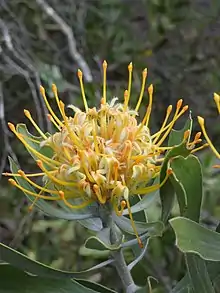 Leucospermum cuneiforme is an upright evergreen shrub with many pustules growing on the lower branches, wedge-shaped leaves, and oval, initially yellow flower heads that later turn orange, with long styles sticking far beyond the perianths, jointly giving the impression of a pincushion. It is called wart-stemmed pincushion in English and luisiesbos (lice-bush) in Afrikaans. The species is common in the southern mountains of South Africa.[3][4]