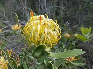 L. cuneiforme has the largest distribution area of the entire genus, and can be found all along the southern coast of the Western Cape and Eastern Cape provinces, and the adjacent mountain ranges between Greyton (Caledon district) in the west and Qolora Mouth in Transkei in the east. It occurs in various climatic circumstances with both dominant rain in winter or summer or without a clear-cut peak. The distribution includes Riviersonderend, Potberg, Langeberg Range, Outeniqua and Swartberg Mountains. It can grow in sclerophyll fynbos, such as on the south-facing slopes of the Langeberg together with other Proteaceae, Erica species, Rutaceae and Restionaceae, but also on grassveld, and subtropical dune forests in the Eastern Cape, where it grows together with plants like Phoenix reclinata and Stangeria eriopus, on the arid fringe of the Little Karoo and the wet margins of the temperate evergreen forests near Knysna and Tsitsikama. It does however stick to poor sandy soils derived from Table Mountain Sandstone, Witteberg Quartzite and stabilised sandy Tertiary deposits. It can be found at sea-level as well as up to over 1,000 m (3,300 ft) altitude. L. cuneiforme is one of the most fire resistant pincushions. Although fire kills the above ground parts of the plant, multiple branches sprout from the rootstock. Mostly the frequency of the fires makes sure shrubs generally are only ½–1 m (1½–3 ft), but when left unchecked, it develops a dominant stem and grows to about 3 m (9.8 ft). Some flowers can be found all year round, but there is a distinct peak from August till February.[2] The unscented but conspicuously coloured flower heads are pollinated by birds that feed on the nectar, such as the Cape sugarbird and some species of sunbird. The birds sit on the flower head and stick their long bills into perianth tubes and so bring their heads and necks in contact with the pollen presenters. Although the flowers are also visited by insects, these do not touch the pollen presenters so do not contribute to the pollination.[4]