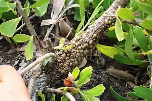 The seeds are covered in a pale fleshy coating called elaiosome that attracts ants. About two months after flowering, the seeds are ripe and get released from the flower heads, and native ants gather them and carry them to their underground nests. Here the elaiosome is consumed. The remaining seed is big, slick and hard and the ants cannot remove it. This way the seeds are safe from seed-eaters and fire. This seed dispersal strategy is called myrmecochory. After a fire, the seeds promptly germinate. So L. cuneiforme has two strategies to survive a fire: myrmecochory and resprouting from the rootstock.[4]