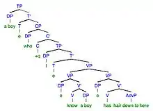 The most commonly used measure of syntax complexity is the mean length of utterance, also known as MLU.[25] This measure is independent from how often children talk and focuses on the complexity and development of their grammatical systems, including morphological and syntactic development.[26] The number representing a person's MLU corresponds to the complexity of the syntax being used. In general, as the MLU increases, the syntactic complexity also increases. Typically, the average MLU corresponds to a child's age due to their increase in working memory, which allows for sentences to be of greater syntactic complexity.[27] For example, the average MLU of a 7-year-old child is 7 words. However, children show more individual variability of syntactic performance with more complex syntax.[26] Complex syntax have a higher number of phrases and clause levels, therefore adding more words to the overall syntactic structure. Seeing as there are more individual differences in MLU and syntactic development as children get older, MLU is particularly used to measure grammatical complexity among school-aged children.[26] Other types of segmentation strategies for discourse are the T-unit and C-unit (communicative unit). If these two measurements are used to account for discourse, the average length of the sentence will be lower than if MLU is used alone. Both the T-units and C-units count each clause as a new unit, hence a lower number of units.