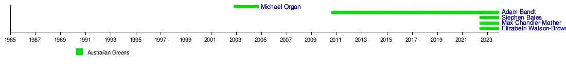 - ↑ Resigned from the Greens and sat as an independent until 23 March 2019.