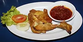Ayam penyet Javanese Chicken dish (fried chicken) Fried chicken dish consisting of fried chicken that is smashed with the pestle against mortar to make it softer, served with sambal, slices of cucumbers, fried tofu and tempeh.
