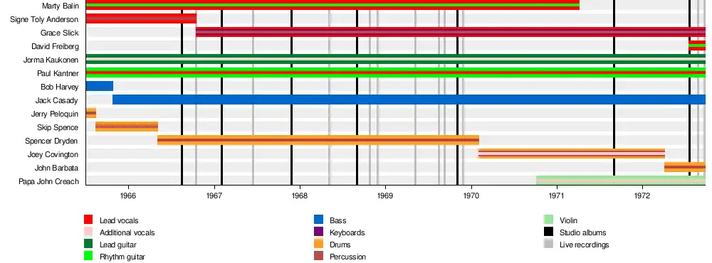 Jefferson Airplane was an American psychedelic rock band from San Francisco, California. Formed in 1965, the group originally featured vocalist and rhythm guitarist Marty Balin, vocalist Signe Toly Anderson, lead guitarist and vocalist Jorma Kaukonen, rhythm guitarist and vocalist Paul Kantner, bassist Bob Harvey and drummer Jerry Peloquin. The band's 1966 to 1970 lineup of Balin, Kaukonen, Kantner, vocalist and keyboardist Grace Slick, bassist Jack Casady and drummer Spencer Dryden were inducted into the Rock and Roll Hall of Fame in 1996.[1][2] Jefferson Airplane was active through 1972, after which Kaukonen and Casady departed to focus on their side project Hot Tuna and the remaining members eventually took on new members and reorganized as Jefferson Starship.[3]