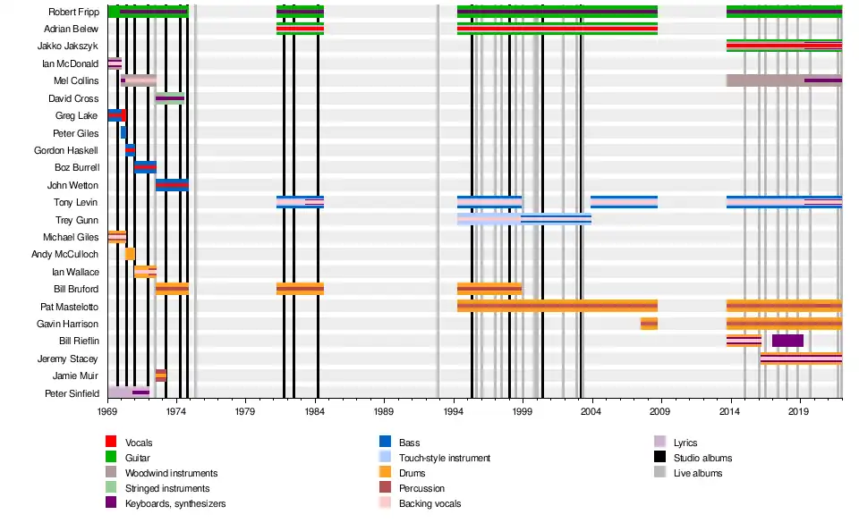 Rieflin was temporarily replaced again for an autumn 2017 tour by Chris Gibson.[27] For the band's 50th anniversary tour in 2019, it was announced that Rieflin would once more be temporarily replaced, this time by Theo Travis.[28] However, after a day of rehearsal, the band opted instead to do the 2019 tour as a seven-piece.[29] Rieflin's parts were divided among other band members, with Jakszyk and Collins adding keyboards to their on-stage rigs, and Levin once again using the synthesizer he used during the 1980s tours.[30] Rieflin died of cancer on March 23, 2020, reducing the line-up to a septet.[31]