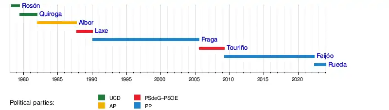Technically speaking, the first two presidents up to 1981 were presidents of a non-autonomous Galicia, since the actual Statute of Autonomy was only passed in April 1981. Nonetheless, they played an important role in setting up the institution.