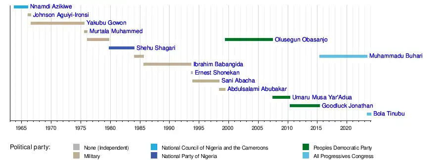 - ↑ "Past Presidents & Heads of State". statehouse.gov.ng. Statehouse of Nigeria. Archived from the original on 14 August 2017. Retrieved 25 March 2022.