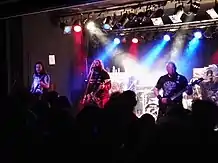 In September 2003, Dias was fired from Soulfly by Cavalera and his wife Gloria (the band's manager), which prompted Doling and Mayorga to leave.[8] The departed members were quickly replaced by returning drummer Nunez, Primer 55 guitarist Bobby Burns on bass, and former Ill Niño guitarist Marc Rizzo.[9] The group's lineup subsequently remained stable for a number of years, before Burns left in July 2010, shortly after the release of Omen.[10] Fireball Ministry's Johny Chow filled in for a string of tour dates,[11] before Tony Campos (formerly of Static-X) joined as Burns' full-time replacement in 2011.[12] Shortly after Campos' addition, Nunez left Soulfly and was replaced temporarily by Cavalera's son Zyon.[13] Borknagar's David Kinkade subsequently joined in September, performing on the group's eighth studio album Enslaved.[14]