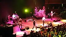 After briefly considering disbanding, Toto returned to touring, with Los Angeles-based British drummer Simon Phillips replacing Jeff Porcaro.[7] The group continued as a four-piece throughout much of the 1990s, before reuniting with Kimball, Williams and Steve Porcaro in 1998 for a tour in promotion of the 20th anniversary compilation Toto XX: 1977–1997.[5][8] After the tour, Kimball remained with the band.[9] The group returned to a lineup with two keyboardists in 2005 with the addition of Greg Phillinganes, who had previously toured with the band in place of Paich.[10] Mike Porcaro was forced to retire in 2007 due to illness, with Leland Sklar filling in.[11] In June 2008, Lukather announced that he had left Toto, signalling the disbandment of the group. Writing on his website, he explained that the band members "had some differences in how business was being done".[12]