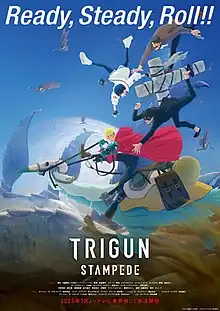 Trigun Stampede is a 2023 anime series based on the manga series of the same name written and illustrated by Yasuhiro Nightow. In June 2022, it was announced the series would be animated by Orange. It aired from January to March 2023.[1] It was directed by Kenji Mutō, with Kōji Tajima serving as concept designer and credited with the character concept.[2][3] Crunchyroll licensed it for a global release.[4] The opening theme is "Tombi" by Kvi Baba, while the ending theme is "Hoshi no Kuzu α" by Salyu and Haruka Nakamura.[5] At end of the 12th episode, it was announced that a "final phase" is in production.[6]