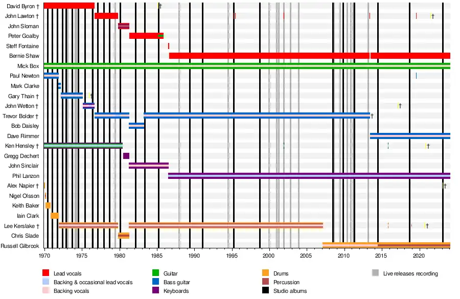 | Ken Hensley | 1969–1980 (plus live guest in 2001 and 2015[24]) (died 2020)[1][7][8][25] |