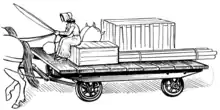 The lorry was rather like a wooden version of the modern car-carrying trailer, intended for towing behind a car, except that the wheels were wooden, with iron tyres and were not close-coupled. The front ones were on a steering undercarriage. The driver's seat was mounted on the top of the headboard.