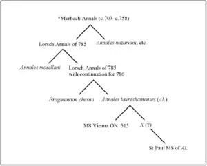 The Lorsch annals for the years up to 785 are almost identical with the Annales mosellani[lower-alpha 4] and also with those of the Fragmentum chesnii,[lower-alpha 5] which also shares with the Sankt-Paul version a brief extension to the year 786.[2][3] From the year 785, the Lorsch annals being dating events since the death of Gregory the Great (605). The 785 entry contains a reference to the "present", indicating perhaps that the original compilation of annals 703–85 was made in the latter year. The annals for 785–803 were compiled independently and not necessarily at Lorsch.