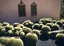 A collection of cacti and euphorbias, including a mass of golden barrel cacti (Echinocactus grusonii) and large, weeping Euphorbia ingens.