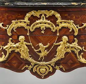 As the period advanced, the marquetry, or inlays of different-colored woods, became finer and more dominant. Various geometric patterns, including the checkerboard, stars, and losanges, appeared, along with bouquets of flowers made of fine marquetry.[20] New techniques of lacquering wood were introduced, based on Chinese and Japanese techniques, which were frequently used on the front panels of commodes. A particular variation, called the façon de Chine or "Chinese fashion" was introduced, which contrasted the gilded bronze ornament and handles against the black lacquered wood. The designs often borrowed motifs from Chinese and Japanese art.[19]
