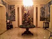Inside, the floor plan includes twelve bedrooms and eighteen baths, two kitchens and one kitchenette, two dining rooms, one breakfast room, a receiving room for state affairs and another for routine business, a living room, a sitting room, two butleries and two security stations for the state troopers assigned to the mansion, and two offices-one for the governor and one for a secretary. Along with the dramatic spiral stairway in the rotunda, there is an elevator running from the basement to the third floor, as well as a system of dumbwaiters. These are wise amenities, considering the size of the house: altogether, the mansion comprises some twenty-five thousand square feet, serviced by a ninety-ton cooling system to battle Louisiana's oppressive summer weather.[2] The main foyer at the mansion features a mural that depicts various aspects of Louisiana History as well as symbolic references to many past Louisiana Governors. This mural was originally painted in the year 2000 under the administration of Governor Mike Foster. It was most recently updated with symbolic references relating to Hurricane Katrina and then Governor Kathleen Blanco.