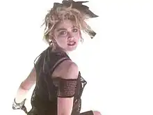 Screenshot of Madonna in the "Lucky Star" music video. After its release, the singer's fashion and style became a trend among the young generation of the time, with the ribbons and cut-off gloves becoming a "must-have", according to the staff of Rolling Stone.[64][10]