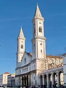 The Ludwigskirche is situated in the northern part of the Ludwigstrasse and was built by the architect Friedrich von Gärtner from 1829 onward (completed 1844). The patron was King Ludwig I of Bavaria. The facade with two steeples was constructed as balance to the Theatinerkirche, which stands diagonally opposite. The floor plan shows the church as a model to a three-aisled Byzantine basilica with the basic geometric figure of the cross of tau. The church is 60 m long and 20 m wide. The towers are 71 meters high and each equipped with six bells, which are named after patron saints of the family of King Ludwig. In the years 2007–2009 the church roof was re-covered in the originally planned mosaic decoration.