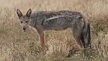 The side-striped jackal is a slender, medium-sized canid, which tends to be slightly larger on average than the black-backed jackal. Body mass ranges from 6.5 to 14 kg (14 to 31 lb), head-and-body length from 69 to 81 cm (27 to 32 in) and tail length from 30 to 41 cm (12 to 16 in).[14] Shoulder height can range from 35 to 50 cm (14 to 20 in).[15] Its pelt is coloured buff-grey. The back is darker grey than the underside, and the tail is black with a grey, almost silver tip. Indistinct white stripes are present on the flanks, running from elbow to hip. The boldness of the markings varies between individuals, with those of adults being better defined than those of juveniles.[7]