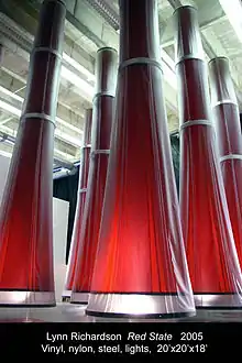 Art critic Amy Karlinsky, writing in BorderCrossings, opined that Richardson's "minimal and collapsible" Red State "hinted at her capacity to generate metaphor": its "monumentality" was "all sham and seductive illusion a tidy reference to both art and politics". And Karlinsky had earlier enjoyed "Richardson's fabulous and funny kinetic sculptures of 2002", which in her view "invited viewer participation and provided wry commentary on Canadian icons and symbolism".[2] But Karlinsky found Inter-Glacial Free Trade Agency.ca "more fraught" by contrast, and agreed with the exhibition curator that Richardson's environmental concerns were integral to her works and had "catalyzed" her into production. How, she wondered, did you suggest something as vast as the Arctic? "A simulated and disjointed landscape confronts the viewer. It is a depopulated, dystopic scenario" with strange artistic details. "Much is eerie, evocative and otherworldly."[2]