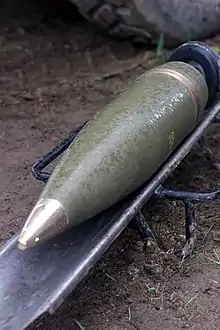 The body consists of a hollow steel shell containing high explosive (either TNT or Composition B) painted olive drab with yellow markings.[1] A fuze adapter is screwed into the body and brazed in place. An eyebolt lifting plug is screwed into the fuze well to assist in transportation. The plug is removed and replaced with a fuze for firing. The complete projectile weighs 43.2 kg, is 800 mm long and contains 15.8% explosive by weight. It is a separate-loading projectile—propellant bags or modular artillery charge system (MACS) charges are loaded separately.