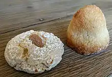 Mandelhörnchen (Almond crescents) are a common treat in Germany. Made of a flour similar to that of the macaroon, they are formed to resemble a crescent, then covered in sliced almonds and dipped in chocolate.[11][12]