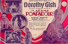 Madame Pompadour is a 1927 British silent historical drama film directed by Herbert Wilcox and starring Dorothy Gish, Antonio Moreno and Nelson Keys.[2] The film depicts the life of Madame Pompadour, mistress of Louis XV of France. It was the first film to be shot at the newly christened Elstree Studios.[3]