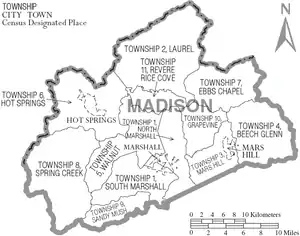 Madison County is a county located in the U.S. state of North Carolina. As of the 2020 census, the population was 21,193.[1] Its county seat is Marshall.[2] Madison County is part of the Asheville, NC Metropolitan Statistical Area.