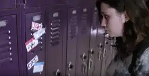 In this scene, a teenage girl finds her locker covered in derogatory gay slurs, such as dyke and fag.