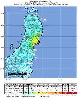 On March 20, 2021 at 18:09 JST (09:09 UTC). The magnitude 6.9 or 7.0 earthquake struck offshore east of Tōhoku, Japan at a depth of 54.0 kilometers (33.6 mi) to 60 kilometers (37 mi).[3][4] It had a maximum JMA intensity of Shindo 5+ while on the Mercalli intensity scale, it earned a rating of VII (Very strong).[5] Power outages and some slight damage in Miyagi was reported.[6]