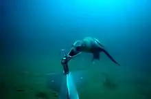 MK 6 uses dolphins and sea lions as sentries to protect harbor installations and ships against unauthorized human swimmers. MK 6 was first operationally deployed with dolphins during the Vietnam War from 1965 to 1975 and in Bahrain from 1986 to 1988.[5] When an enemy diver is detected by a dolphin, the dolphin approaches from behind and bumps a device into the back of the enemy's air tank. This device is attached to a buoy which then explodes, alerting the Navy personnel of the intruder. Sea lions carry a similar device in their mouth, but instead attach it by hand-cuffing one of the enemy's limbs. The animals depend on their superior underwater senses and swimming ability to defend against counterattacks.
