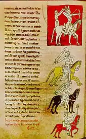 Twelfth-century depiction of Iberian cavalry: a crowned man with a bow, two knights with swords and a standard-bearer carrying a cross into battle.