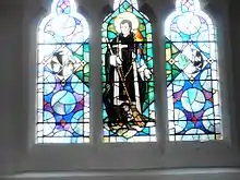 A mid-twentieth-century stained glass representation of Martin de Porres in St Pancras Church, Ipswich with a broom, rosary, parrot and monkey