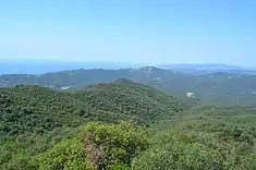 The ranges meet the sea between Sant Feliu de Guixols and Lloret de Mar, running westwards far as Caldes de Malavella. Most mountains are covered in occasionally dense forests of cork oak, holm oak, pine and Mediterranean shrub. The valleys are irrigated by seasonal mountain streams subject to the typically Mediterranean climate. However, the nature of the terrain favours up welling of water throughout the year, along with humidity and precipitation caused by the screen effect of the mountains before the marine winds. The botanic species, as well as the fauna show some Eurosiberian and Atlantic influences.[2]
