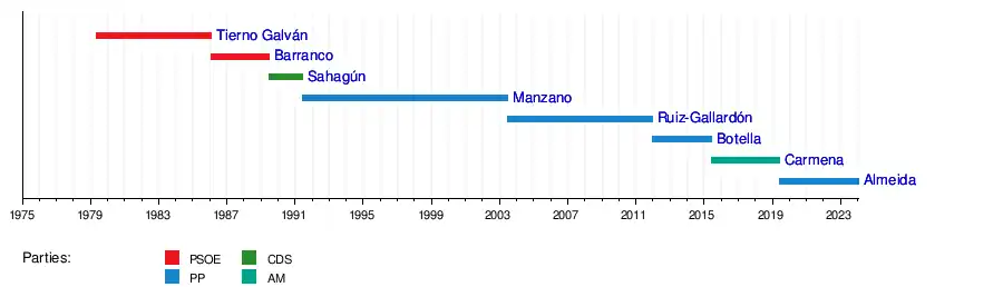 - ↑ From 22 December 2011 to 27 December 2011, Manuel Cobo Vega served as interim Mayor of Madrid