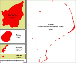 A microstate or ministate is a sovereign state having a very small population or land area, usually both. However, the meanings of "state" and "very small" are not well-defined in international law.[1] Some recent attempts to define microstates have focused on identifying qualitative features that are linked to their size and population, such as partial delegation of their sovereignty to larger states, such as for international defense.