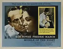 Middle of the Night is a 1959 American drama film directed by Delbert Mann, and released by Columbia Pictures.[3][4] It was entered into the 1959 Cannes Film Festival.[5] It stars Fredric March and Kim Novak. The screenplay was adapted by Paddy Chayefsky from his Broadway play of the same name.
