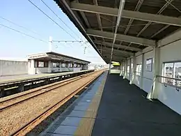 The station has two elevated side platforms, with the station building located underneath. However, the platforms are not matched. Platform 1 can handle a full train of 10 carriages, but Platform 2 is short and can accommodate only four carriages in length. The station building has automated ticket machines, TOICA automated turnstiles and is staffed.