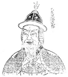 Defeating Goguryeo had been an obsession with Emperor Taizong,[75] and after his death in 649, his son Emperor Gaozong continued his ambition. Upon the suggestion of Kim Chunchu, the Silla–Tang alliance first conquered Baekje in 660 to break up the Goguryeo–Baekje alliance, and then turned its full attention to Goguryeo.[76] However, Emperor Gaozong, too, was unable to defeat Goguryeo led by Yeon Gaesomun;[76][77] one of Yeon Gaesomun's most notable victories came in 662 at the Battle of Sasu (蛇水), where he annihilated the Tang forces and killed the invading ex-rebel Nanman general Pang Xiaotai (龐孝泰) and all 13 of his sons.[78][79] Pang Xiaotai was an ethnic minority Nanman chief from Guangxi who had previously rebelled against the Tang dynasty but was defeated by the Tang and he and his people were forcibly conscripted by the Tang into fighting against Goguryeo.[80][81][82][83][84][85][86] Hence, while Yeon Gaesomun was alive, Tang could not defeat Goguryeo.[87]