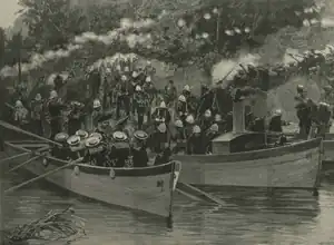 On 11 November, Stewart's force landed at Barra Point, consisting of 451 of all ranks. They were supported with heavy cover fire from the Plumper (under Lieutenant Cresey), the Parmilia, and an armed colonial schooner. The Mandinkas were estimated at 2500-3000 strong and were skilfully covered from the gunfire by their entrenchments and by the shelter of the high grass. They sustained heavy fire upon Stewart's force who were landing directly in their front. Despite this, the British pushed on, and after an hour's hard fighting, during which the Mandinkas contested every inch of ground, they succeeded in driving them from their entrenchments at bayonet point and pursued them for some distance through the bush. The British lost two men in this action, with three officers and 47 other ranks wounded. Over the next few days, the British focused on landing the guns and placing Fort Bullen in a state of defence. At daybreak on 17 November, the British marched to attack Essau, leaving Fort Bullen in the charge of the crew of the Plumper.[1]
