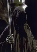 In the Rankin-Bass adaptation of The Return of the King, the Nazgûl are robed skeletons with white hair. They ride winged horses, although the Witch-king rides a creature more in line with the book when he confronts Éowyn.[19] The 1981 BBC Radio serial of The Lord of the Rings has the Nazgûl chant the Ring-inscription in the Black Speech of Mordor.[20] The 1991 Russian television play Khraniteli features a group of Nazgûl galloping through a snowy pine forest; they wear black cloaks, with glimpses of red equipment.[21]