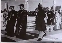 On the recommendation of the Viceroy of India, Lord Elgin in 1898, in early 1899 Sir Brian Egerton (of the Egerton family and former tutor to Maharajah of Bikaner Ganga Singh) was appointed as Mir Osman Ali Khan's English tutor for two years.[3] During this period he lived away from the principal palace. He lived on his own to avoid the atmosphere of the palace quarters under the guidance of Sir Brian and other British officials and mentors, so that he could flourish as a gentleman of the highest class. Sir Brian Egerton recorded that as a child, Mir Osman Ali Khan was magnanimous and "anxious to learn". Because of the indomitable attitude of zenana (the women) who were determined to send Mir Osman Ali Khan out of Hyderabad for further studies, he pursued them at Mayo College after consultation with the principal nobles of the Paigah family.[29][30]
