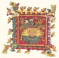 An Aztec hemispherical iron pyrite mirror in the collection of the Musée de l'Homme in Paris has a sculpted representation of the wind god Ehecatl on its convex back.[77] Xipe Totec, "Our Lord the Flayed One", was the Aztec god of rebirth.[78] One of his names was Tlatlauquitzezcatl, meaning "Red Mirror" or "Mirror of Fiery Brightness".[79] The Aztec Emperor Moctezuma II was said to have seen the overthrow of his empire in a mirror; some fishermen caught a strange bird with a mirror on its forehead. They brought the bird before their emperor, who peered into the mirror and saw warriors mounted on deer.[7][nb 2] This purported incident was described by Franciscan friar Bernardino de Sahagún in his Historia de las cosas de Nueva España ("History of the things of New Spain"):[80]