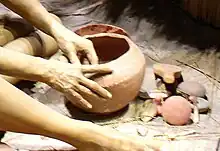 The potters used slab-built construction and the "coiling" method,[3][4] which involved working the clay into a long string which was wound round to form a shape and then modeled to form smooth walls. The potter's wheel was not used by pre-contact Native Americans. Some decoration of the clay was done at this stage by incising, defenstrating, adding shapes, or stamping designs into the wet clay. After the piece had dried completely, it was fired in a wood fire.